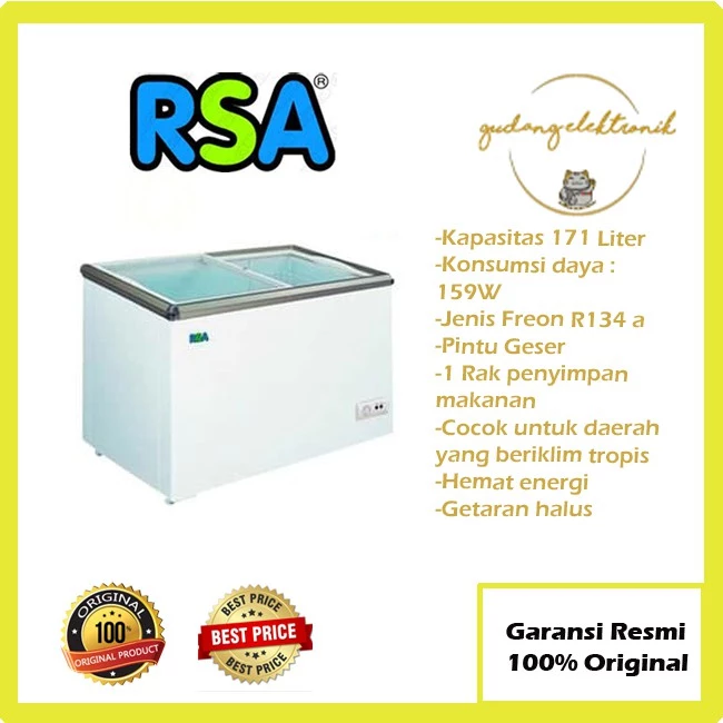 RSA heast freezer digunakan untuk keperluan mini market, restoran, hotel hingga supermarket besar untuk menyimpan aneka makan beku, seperti ES crim, daging beku, seafood, baskso, nugget, DLL. RSA XS-320 merupakan tipe dengan pintu dibuka keatas ( lift up ) dan memiliki kapasitas 288 L
